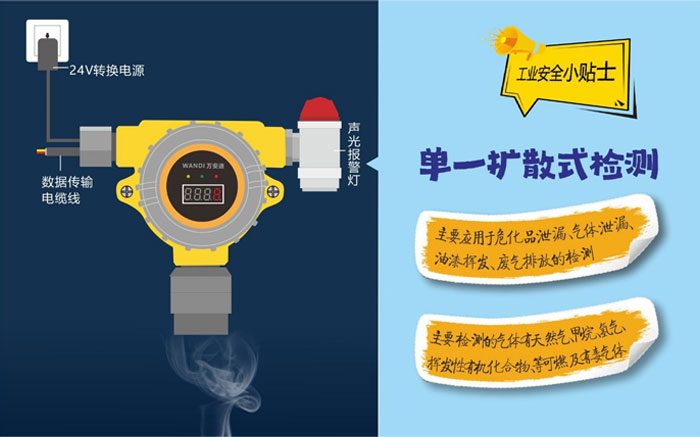 擴(kuò)散在線式氣體探測器能夠?qū)崟r的檢查空氣中是否含有一種或多種可燃及有毒有害氣體,一般使用于開放場合,如敞開的作業(yè)車間,檢測空氣中泄露的氣體。這種方法受檢測環(huán)境的影響,如環(huán)境溫濕度、風(fēng)速風(fēng)向等,監(jiān)測數(shù)據(jù)會存在一定的誤差。